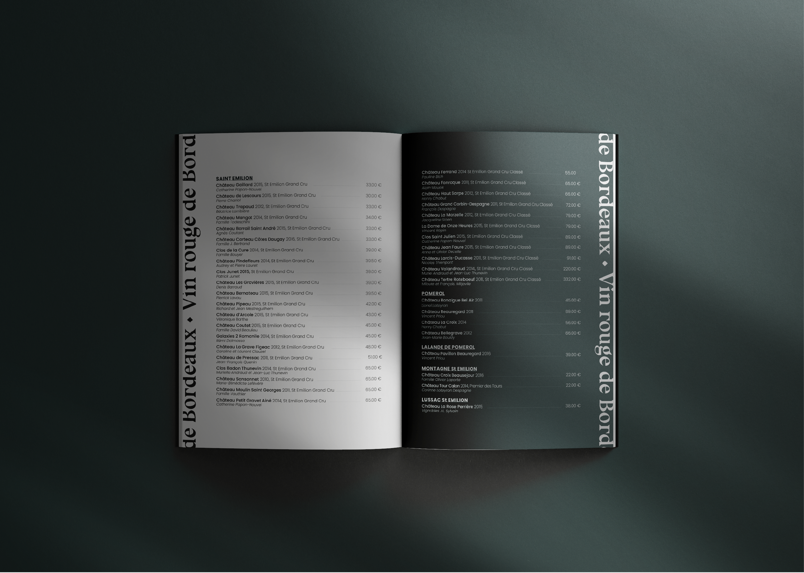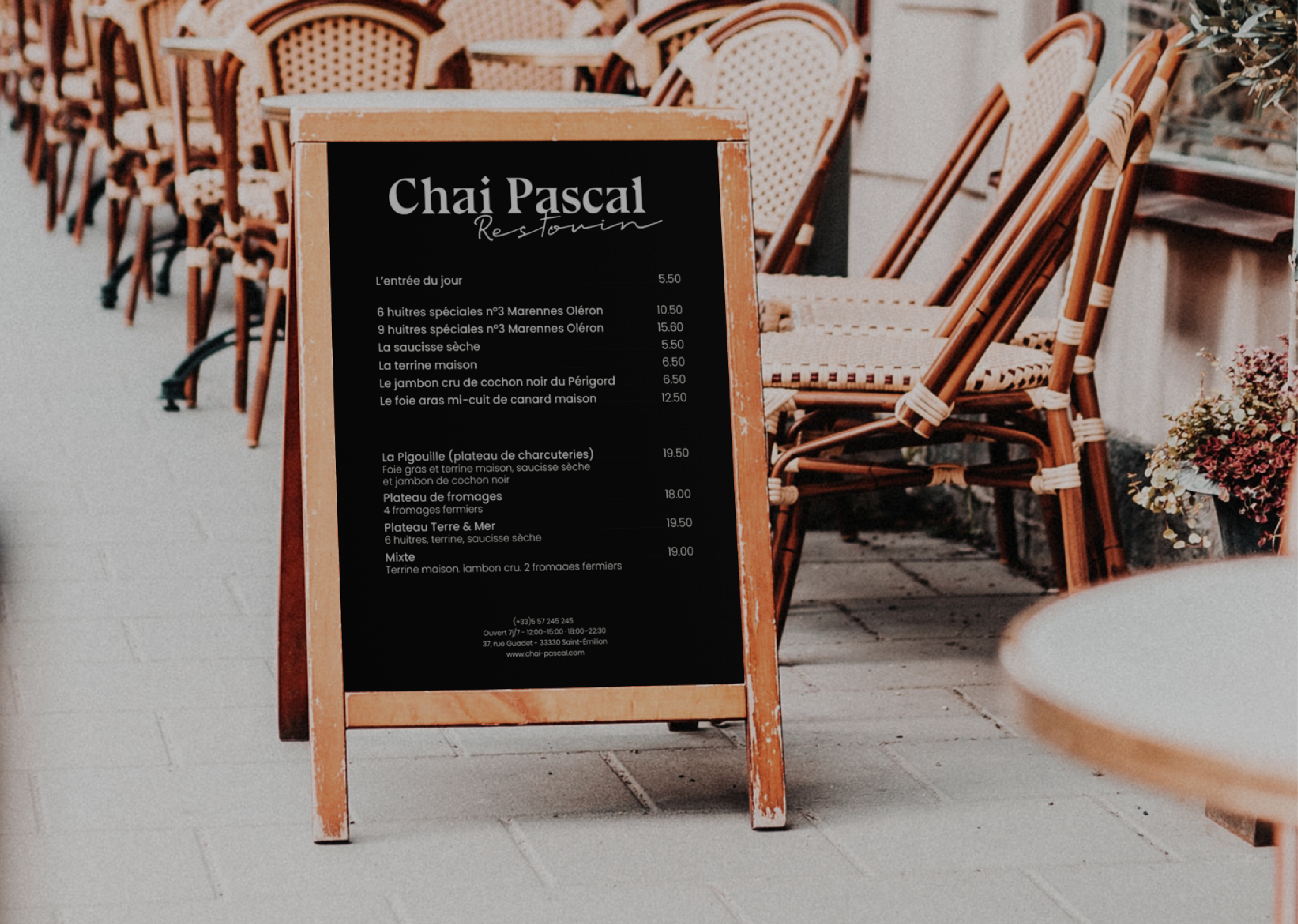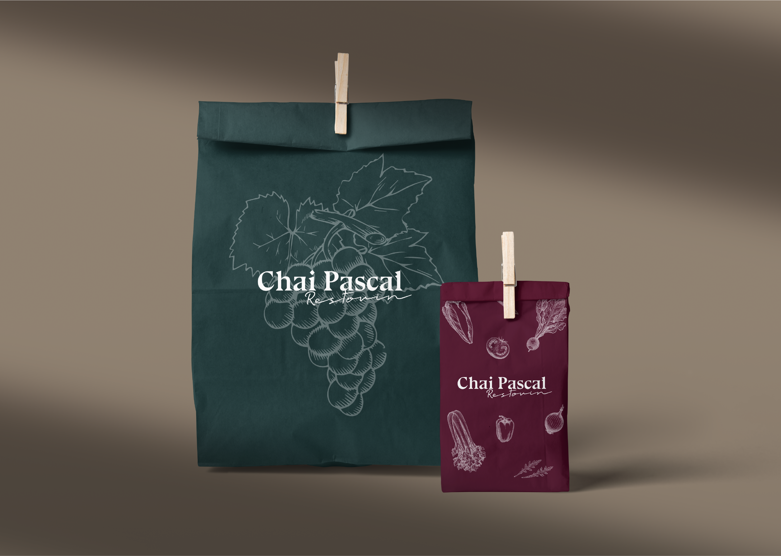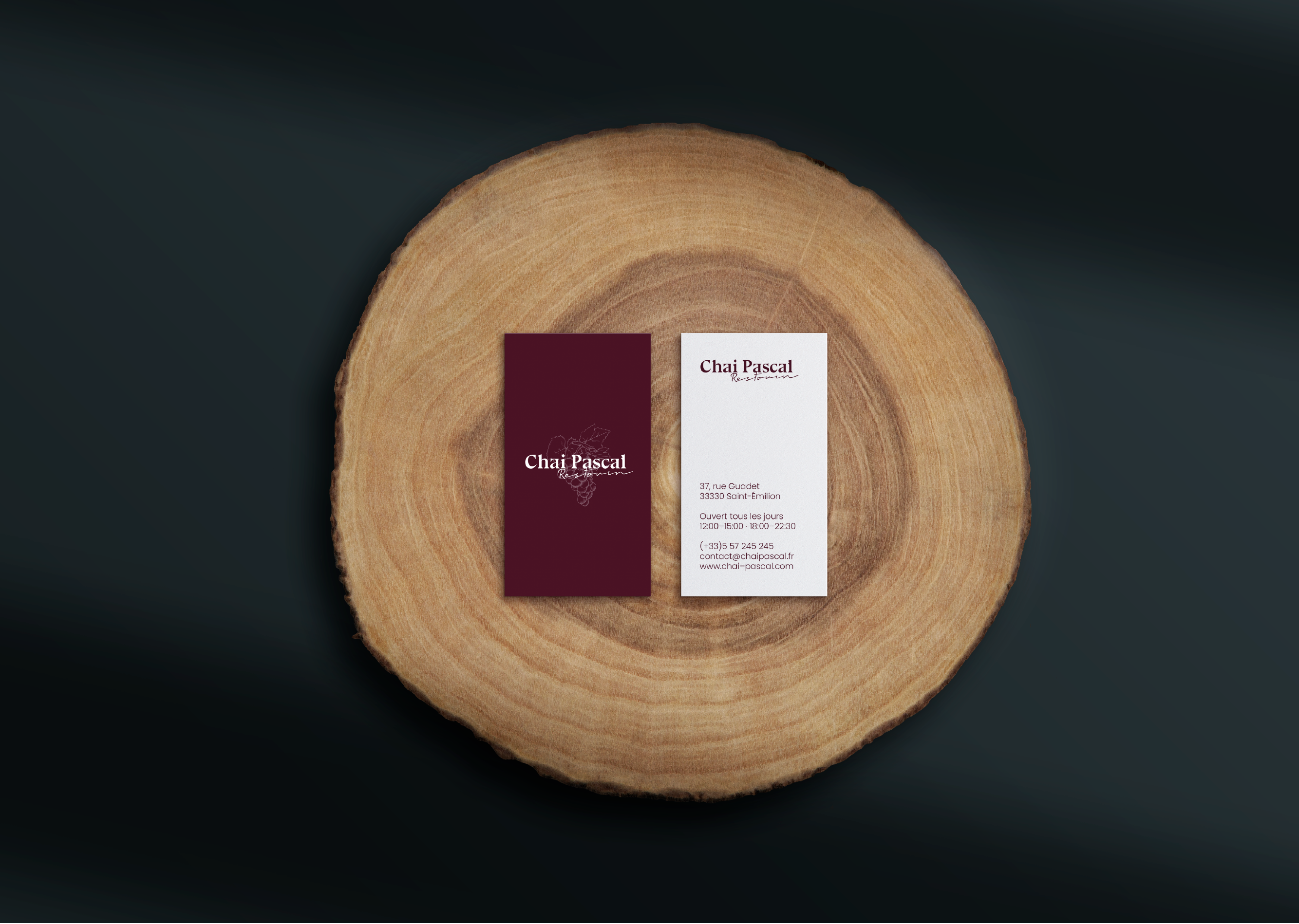 Chai Pascal is a wine restaurant located in Saint Emilion, Nouvelle Aquitaine. The new branding is centered around the main product: wine. The restaurant aims to show- case the winegrowers of the region, as the owner is also a viticulturist and produces her own wine. It was important to place this product at the center of the branding